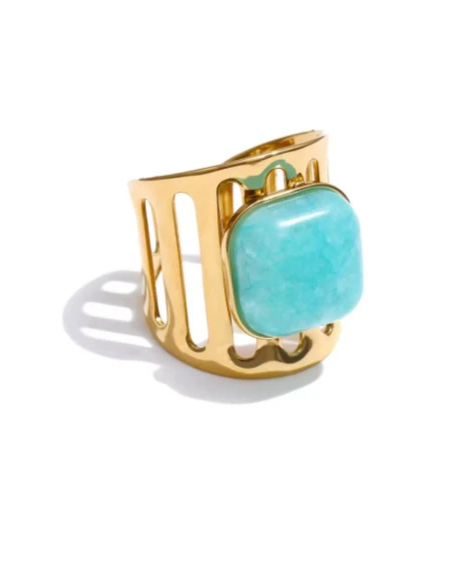 Make a bold yet elegant statement with the Connley Ring, featuring a stunning combination of natural Amazonite stone and delicate shell inlay. Set on a wide, beautifully contoured band, this piece is crafted from stainless steel and finished with 18K gold plating for a rich, lasting shine.
