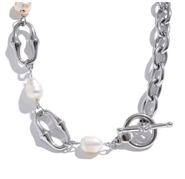 The Dailia Necklace, features exquisite natural freshwater pearls strung on a chic chunky chain. This trendy piece is 18K plated, ensuring a luxurious finish that complements any outfit.