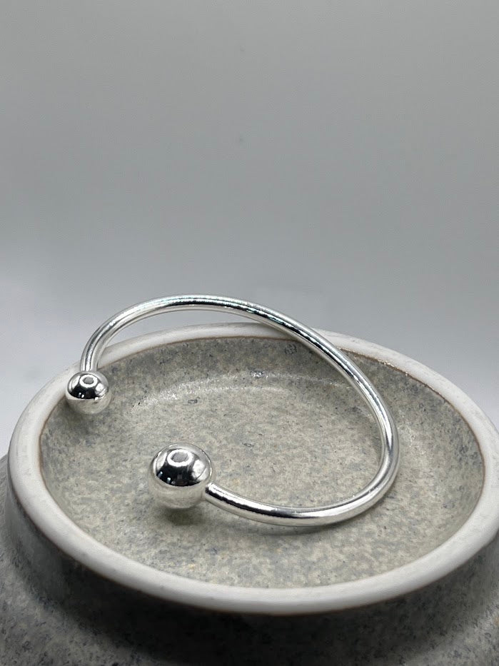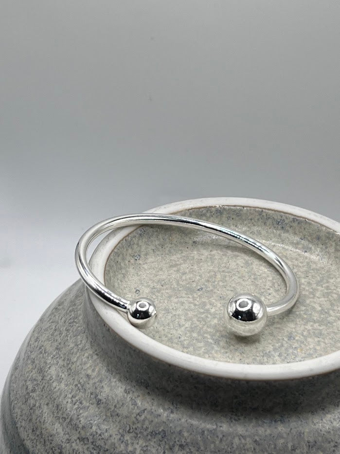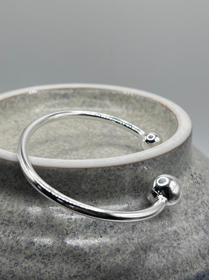 The Ellory Bangle is a classic piece featuring a sleek design with silver balls on either end and adjustable sizing. Perfect for any occasion, this timeless bangle can be worn on its own for a subtle touch of elegance or stacked for a bolder statement.