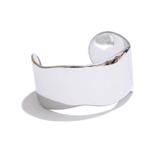 Elevate your wrist game with the Fairely Cuff Bracelet, crafted from polished stainless steel and plated in luxurious 18K gold. This wide cuff bangle combines durability with elegance, making it the perfect statement piece for any outfit.