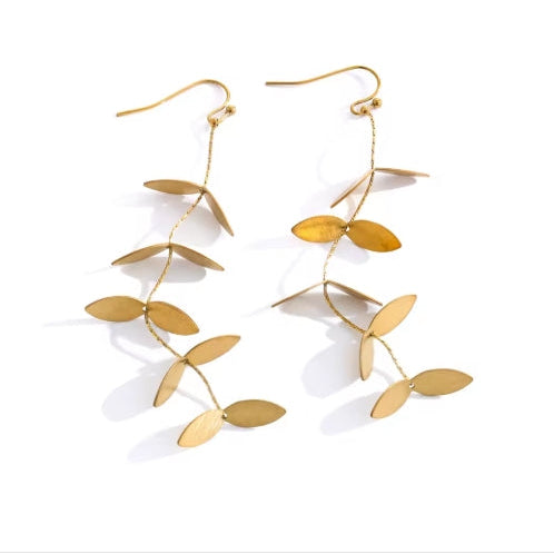 The Fia Earrings bring retro elegance to life with their delicate leaf design and graceful drop style. Crafted from stainless steel and plated in radiant 18K gold, they offer a timeless shine that lasts. Lightweight yet striking, these long hanging earrings add a touch of vintage charm to any outfit, effortlessly transitioning from day to night with beauty and sophistication.