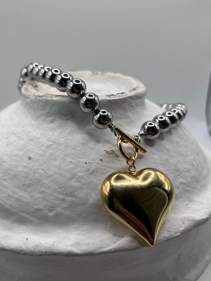 Make a bold statement with our stunning Jada Necklace. This eye-catching piece features silver beads accentuated by a striking gold heart centrepiece. The T-bar closure adds a touch of sophistication, ensuring a secure and stylish fit.