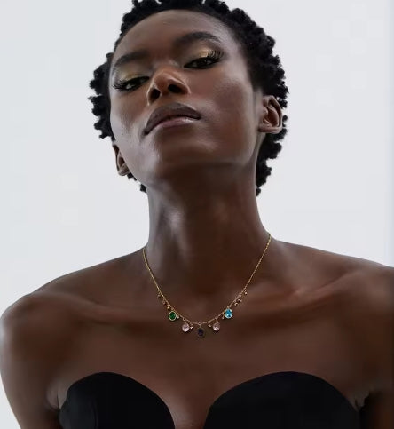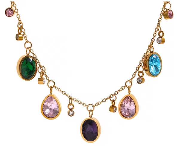 Discover luxury with the Karra Necklace. This elegant piece features colorful cubic zirconia set in stainless steel and plated with 18k gold for a stunning finish. Designed to dazzle, it's perfect for any occasion.