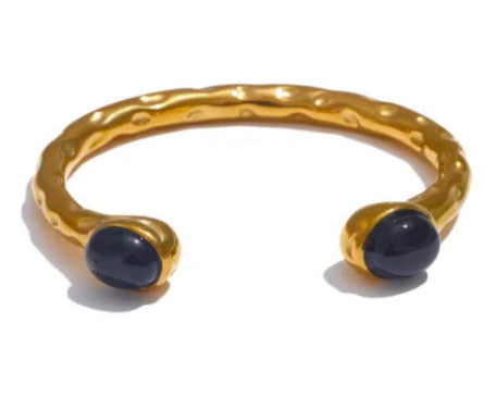 Elevate your wrist game with the Kat Bangle, a striking open‑cuff bracelet crafted for modern elegance and everyday wear. At its heart sits a rich dark blue stone, the sleek 18K gold‑plated stainless steel band is not only stunning—it’s water‑resistant and tarnish‑free, ready for wherever life takes you.