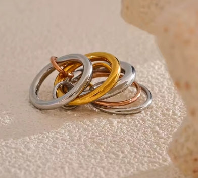 The Milton Ring features a stylish design with five interlinked bands, available in three vibrant colors. Each ring is plated with 18K gold, ensuring a durable and luxurious finish. This versatile piece is perfect for adding a touch of elegance.