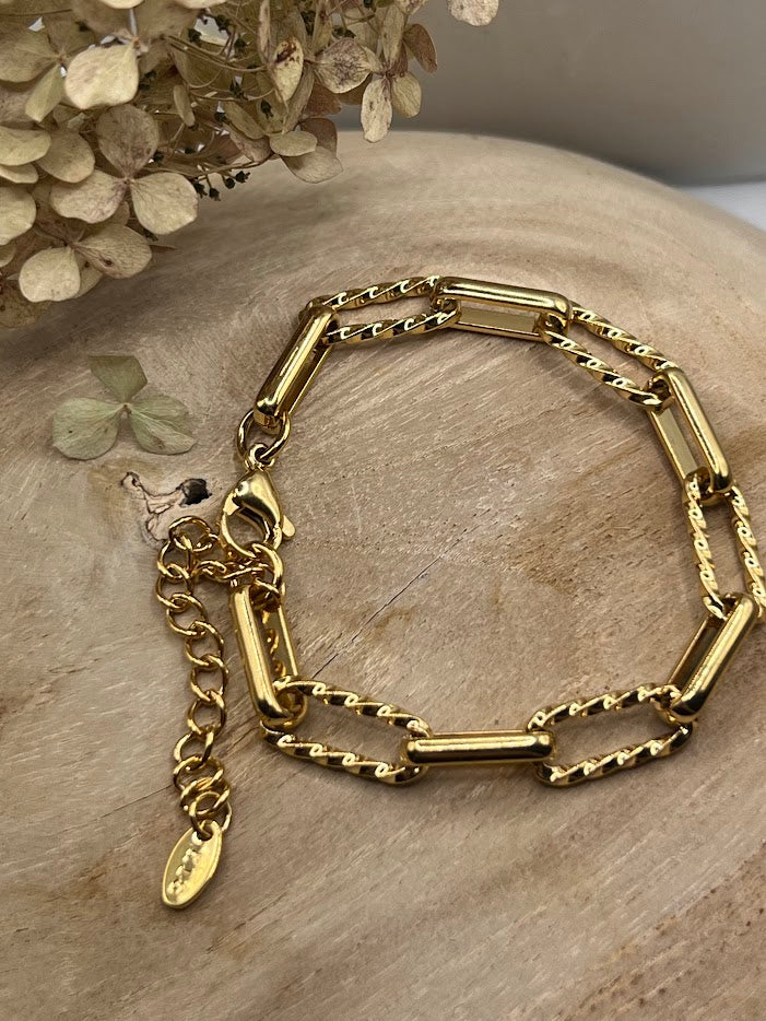 Elevate your style with the Moxley Paperclip Chain Bracelet. This 18K gold plated stainless steel piece features an adjustable chain, ensuring a perfect fit for any wrist. Its chunky, stackable design makes it a versatile addition to your jewelry collection, perfect for layering or wearing solo. Add a touch of elegance and modern flair to your wardrobe with this stunning bracelet.