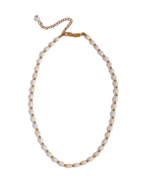 Add a touch of elegance to your look with the Pauli Necklace. Featuring lustrous Freshwater Pearls and sleek Stainless Steel Beads, this waterproof, gold-tone necklace is perfect for any occasion.