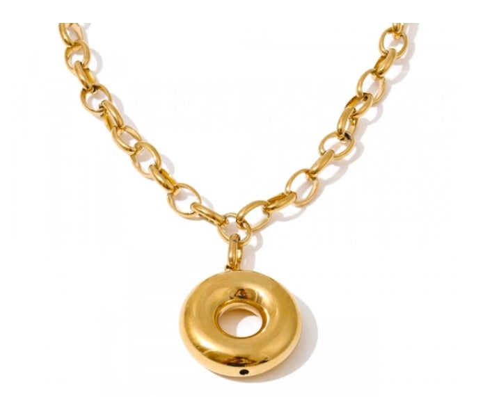 Bold yet refined, the Solenne Necklace features a smooth, chunky round pendant that radiates effortless sophistication. Crafted from stainless steel and finished with 18K gold plating, it’s a true statement piece that elevates any outfit. Waterproof and tarnish-resistant, this necklace blends timeless style with everyday durability — a modern classic designed to shine.